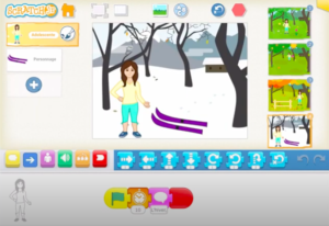 - L'animateur propose le défi suivant: créer un mini album composé de quatre pages avec l'arrière-plan d'une saison différente. Ajouter le même lutin (qui ressemble à l'élève ou personnalisé avec sa photo) pour chaque page et programmer le défilement des pages.