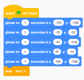 - Après chaque coordonnée, insérez le bloc « Costume suivant ». Cela fera un mouvement saccadé.