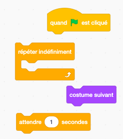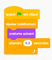 - Si vous désirez faire un mouvement plus fluide, nous vous recommandons de créer une deuxième séquence de scripts. Placez le bloc « Costume suivant » dans une boucle. Mettre un peu de temps entre chaque changement de costume.