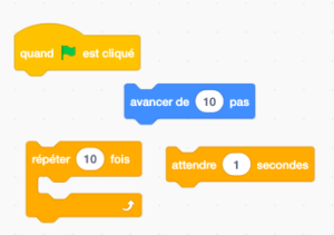 On découvre la répétition du bloc [Avancer de 10] et l'utilité du bloc [Répéter 10 fois]. On joue avec le nombre.