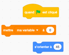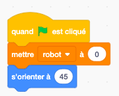 - Les élèves commencent une séquence d'initialisation avec les blocs [s'orienter à 45 degrés] et fixent le sens