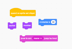 - Les élèves ajoutent un deuxième lutin à leur jeu et ajoutent des blocs [Apparence] à la séquence [quand ce lutin est cliqué].