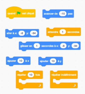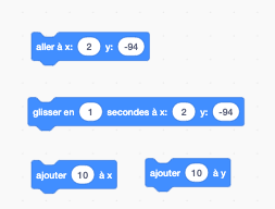- On découvre que le lutin peut se déplacer en haut, en bas, ou à tout autre endroit sur la scène à l’aide des coordonnées. Il peut aussi se déplacer en glissant. On peut aussi ajouter des déplacements sur l’abscisse ou l’ordonnée.