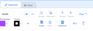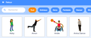 - Les lutins et l’arrière-plan : On découvre comment ajouter un lutin et comment le supprimer. On découvre la panoplie de lutins disponibles. On sélectionne un lutin de son choix.
