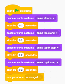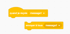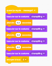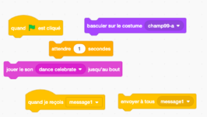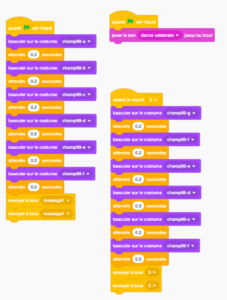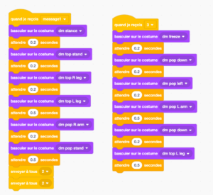 - Afin que les deux danseurs ne dansent pas en même temps, il suffit d’ajouter les blocs : « Quand je reçois message 1 » et « Envoyer à message 1 ». Cela permet une alternance entre les messages.